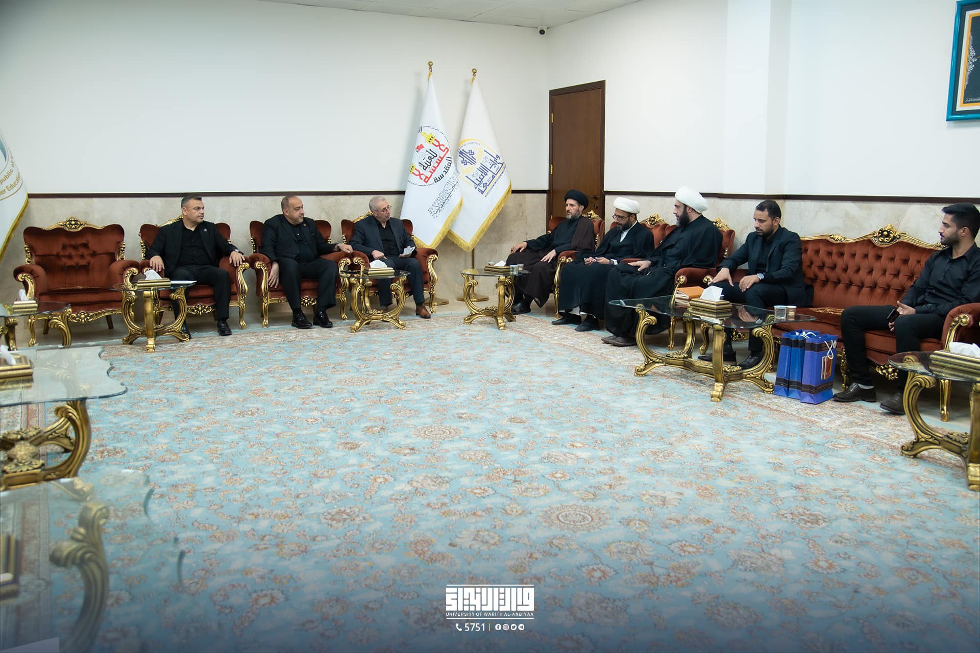 The President of Warith Al-Anbia University (peace be upon him), Professor Ibrahim Saeed Al-Hayawi, accompanied by Professor Dr. Waqid Al-Moussawi, Assistant President of the University for Scientific Affairs, and Assistant Professor Dr. Talal Faeq Al-Kamali, Dean of the College of Islamic Sciences, received a delegation from the Scientific Committee of Warith Al-Anbia Foundation for Specialized Studies in the Husseini Renaissance affiliated with the Holy Shrine of Imam Hussain.