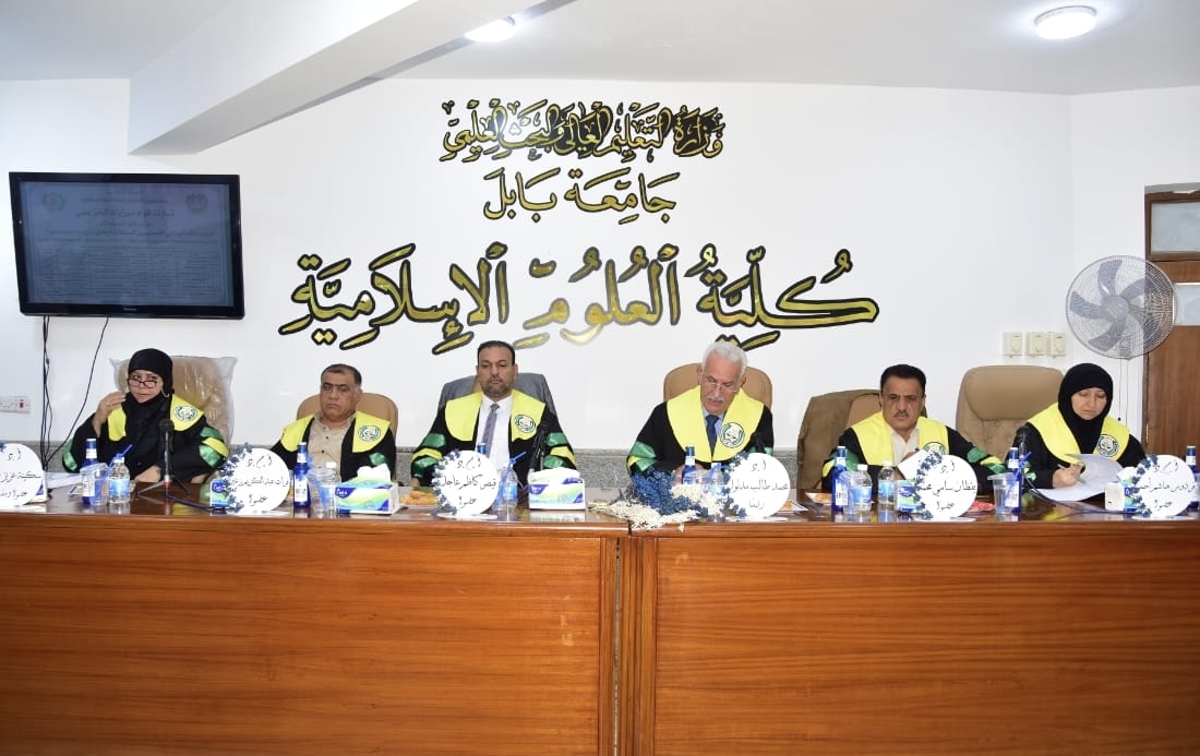 The discussion was attended by a number of prominent academic figures, including the Dean of the College, Prof. Dr. Hassan Obaid Al-Maamouri, the Administrative Assistant, Prof. Dr. Hassan Ghazi Al-Saadi, the Scientific Assistant, Assistant Professor Dr. Riyadh Rahim Thaban, in addition to the Head of the Department of Quranic Sciences, Prof. Dr. Haider Muhammad Hanaa Al-Shalah, and a number of college professors.