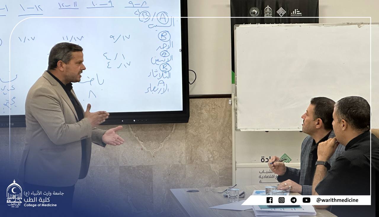The Dean of the College of Medicine, represented by the Dean of the College, Prof. Dr. Ali Abd Saadoun, the Assistant Dean for Scientific Affairs, Lecturer Dr. Riyad Hanioh, and the Associate Dean for Administrative Affairs, Prof. Dr. Ali Mansour, met with the heads of the clinical branches to find out the latest preparations for the new academic year and complete the schedules for the fourth stage and the distribution of students.