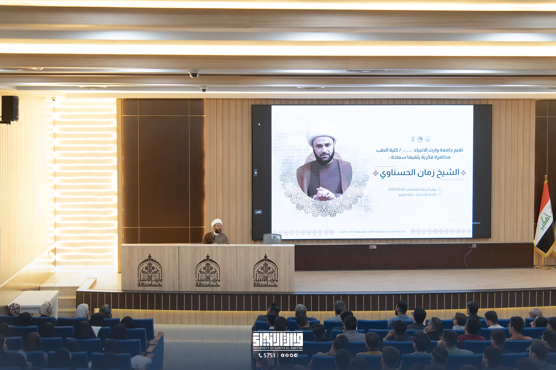 In the presence of the Dean of the College, Professor Dr. Ali Abd Saadoun Al-Ghazi. The College of Medicine at the University of Heir al-Anbiya (peace be upon him) hosted His Eminence Sheikh Zaman al-Hasnawi (may his success be long) to give an educational lecture to university students.