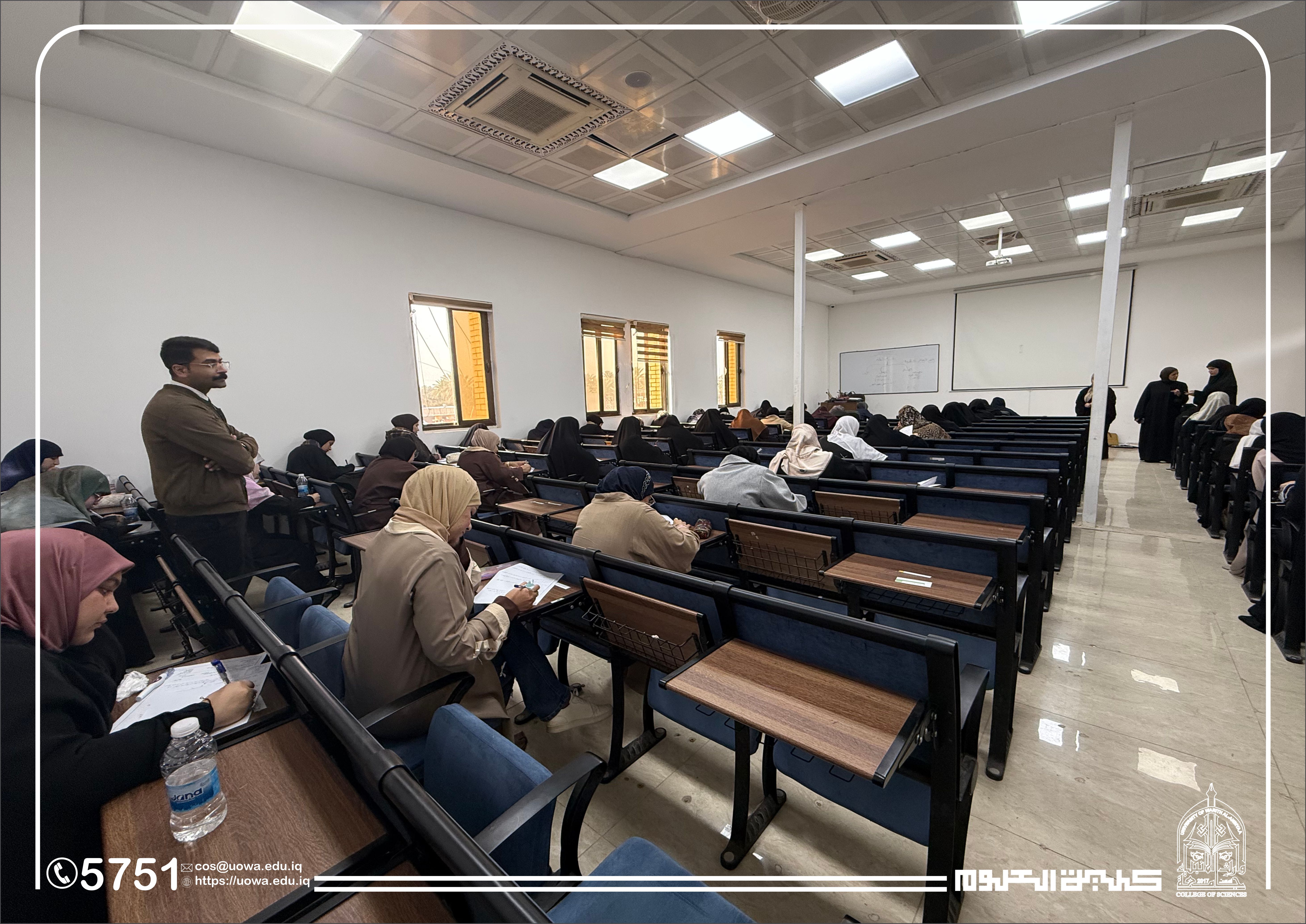 In the context of his continuous follow-up of the academic process and his commitment to providing an appropriate examination environment, the Dean of the College of Science at Warith Al-Anbiyaa University (peace be upon him) conducted an inspection tour of the examination halls to monitor the progress of the midterm examinations for first-year students in the Departments of Medical Physics and Forensic Evidence.