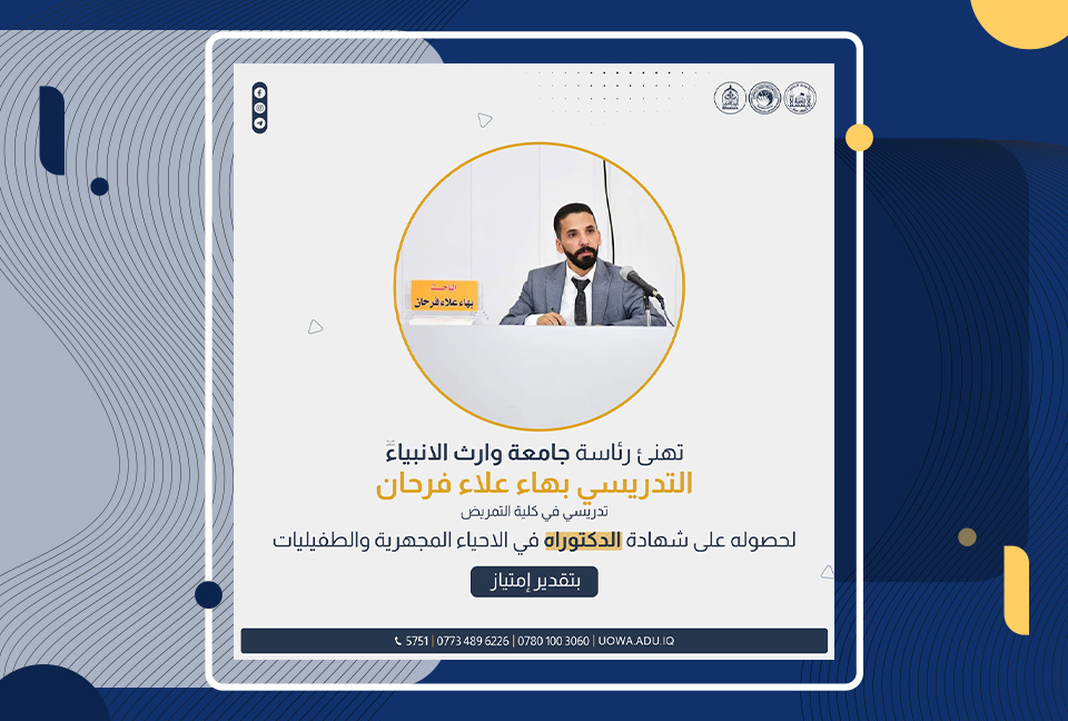 thesis, and has accordingly been awarded a Ph.D. in the field of microbiology and parasitology. The Presidency of the University of Warith Al-Anbiyaa and the Deanship of the College of Nursing extend their sincere congratulations and blessings on this momentous occasion. We wish him every success in his academic career.