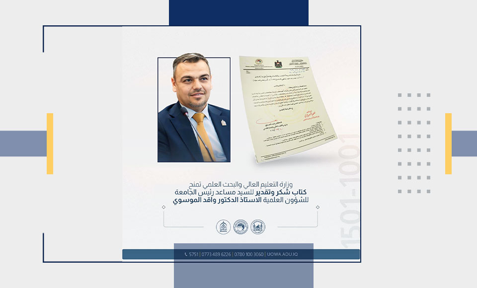 Professor Dr Waqid Al-Moussawi, Vice President for Academic Affairs at the University of Warith Al-Anbiyaa (PBUH), received a letter of recognition and appreciation from His Excellency, Minister of Higher Education and Scientific Research, Dr Naeem Al-Aboudi, as a gesture of appreciation for his academic efforts.
