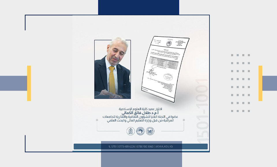 Assistant Professor Dr. Talal Faiq Al-Kamali, Dean of the College of Islamic Sciences at the University of Warith Al-Anbiyaa (PBUH), has been appointed to the Supreme Ministerial Committee on "Cultural and Intellectual Affairs of Universities."