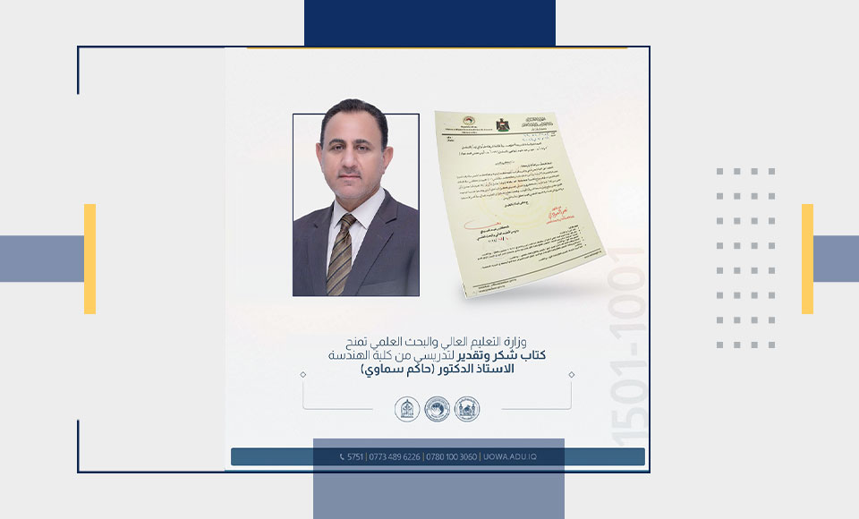 As part of his appreciation for the academic efforts, His Excellency the Minister of Higher Education and Scientific Research, Dr. Naeem Al-Aboudi, granted a letter of recognition and appreciation to Professor Dr. Hakim Samawi, a lecturer at the College of Engineering at the University of Warith Al-Anbiyaa (PBUH).