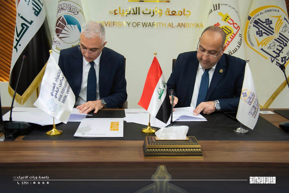 Professor Dr. Ibrahim Saeed Al-Hayawi, President of the University of Warith Al-Anbiyaa (PBUH), signed a scientific cooperation agreement with the Arab Union for Digital Empowerment in the State of Libya, represented by its President, Professor Dr. Abbas Al-Jubouri, in the presence of the university’s vice presidents.